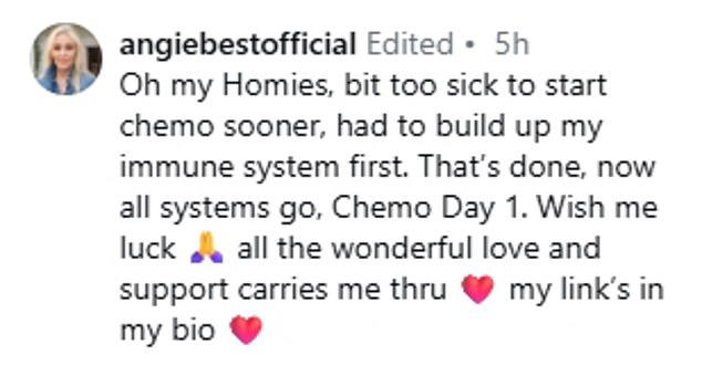 Angie Best Reveals She Has Started Chemotherapy for Colon Cancer in Health Update to Fans After She Was ‘Too Sick’ to Begin Treatment Sooner