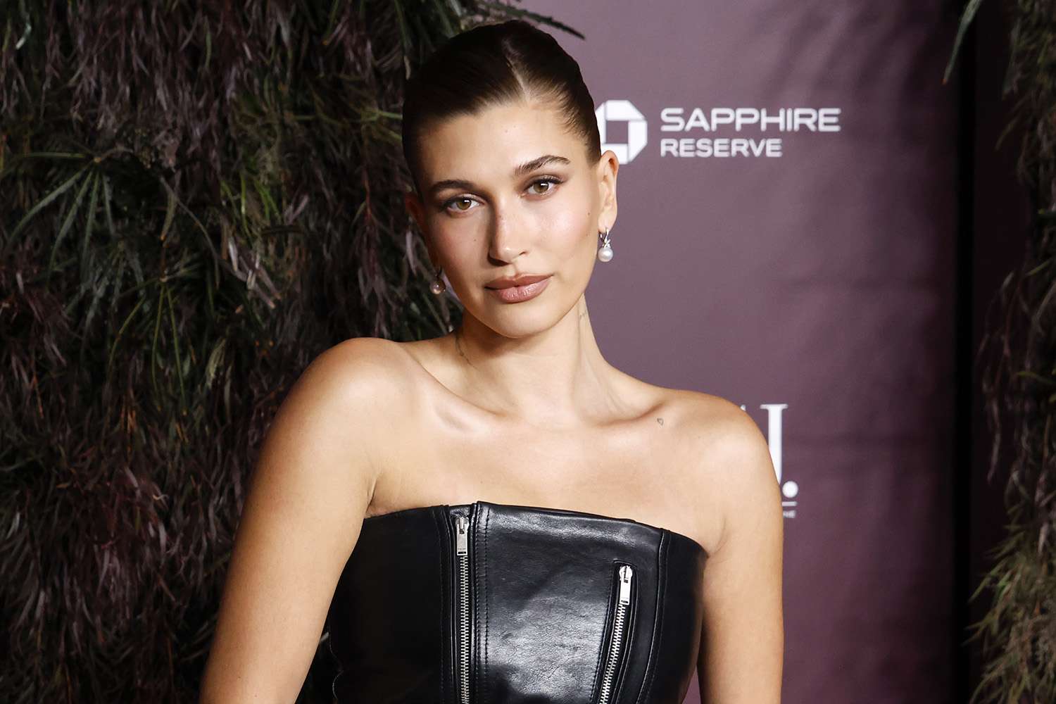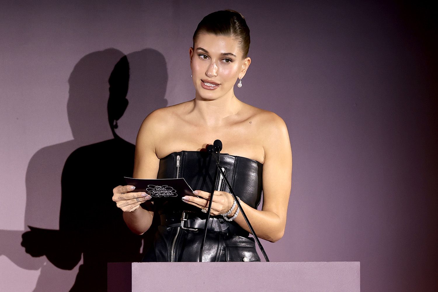 In addition to her impactful speech, Hailey Bieber’s appearance at the Wall Street Journal Innovator Awards caught the attention of fashion enthusiasts. She wore a striking strapless leather top paired with a matching pencil skirt, styled by Dani Michelle. The ensemble was complemented by dark pantyhose, white pointy-toed slingback pumps, and exquisite Tiffany & Co. accessories, including pearl-and-diamond earrings valued at $13,200 and a mixed cluster diamond bracelet.