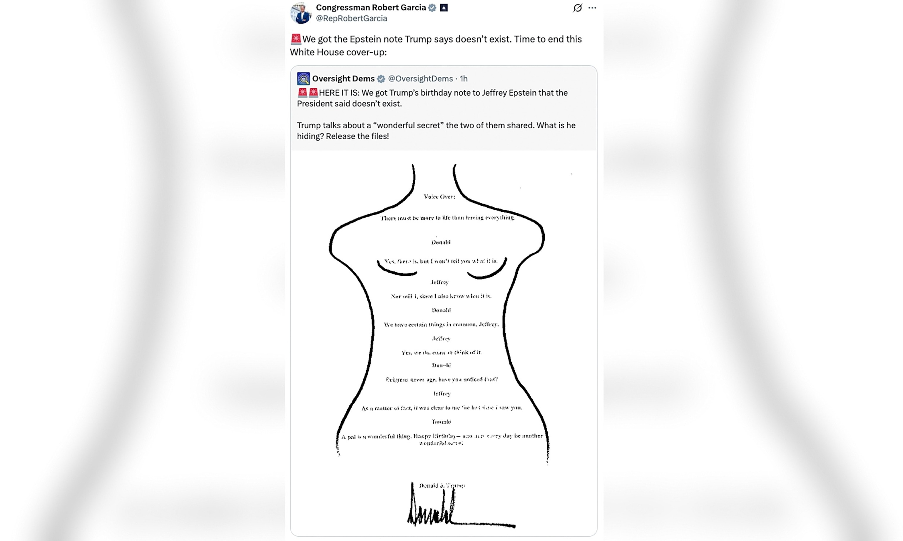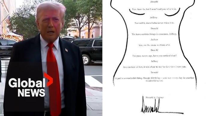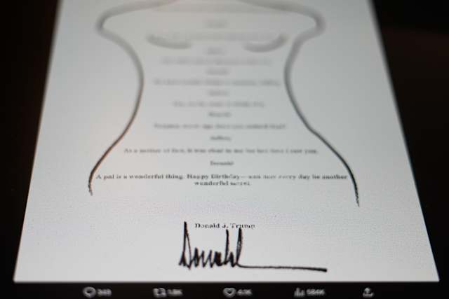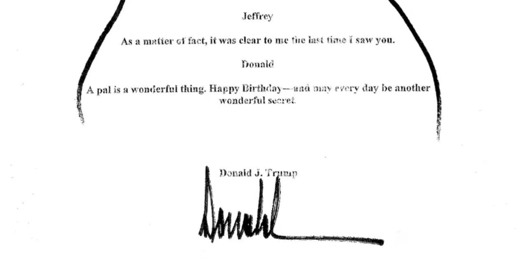 The poem, written inside a crude outline of a female body with markings on the chest and pubic areas, reads: “We have certain things in common, Jeffrey. A pal is a wonderful thing. Happy Birthday—and may every day be another wonderful secret.” Trump has denied authoring the poem, but the card’s replica prominently features his signature, making the display a powerful symbol of the ongoing controversy.