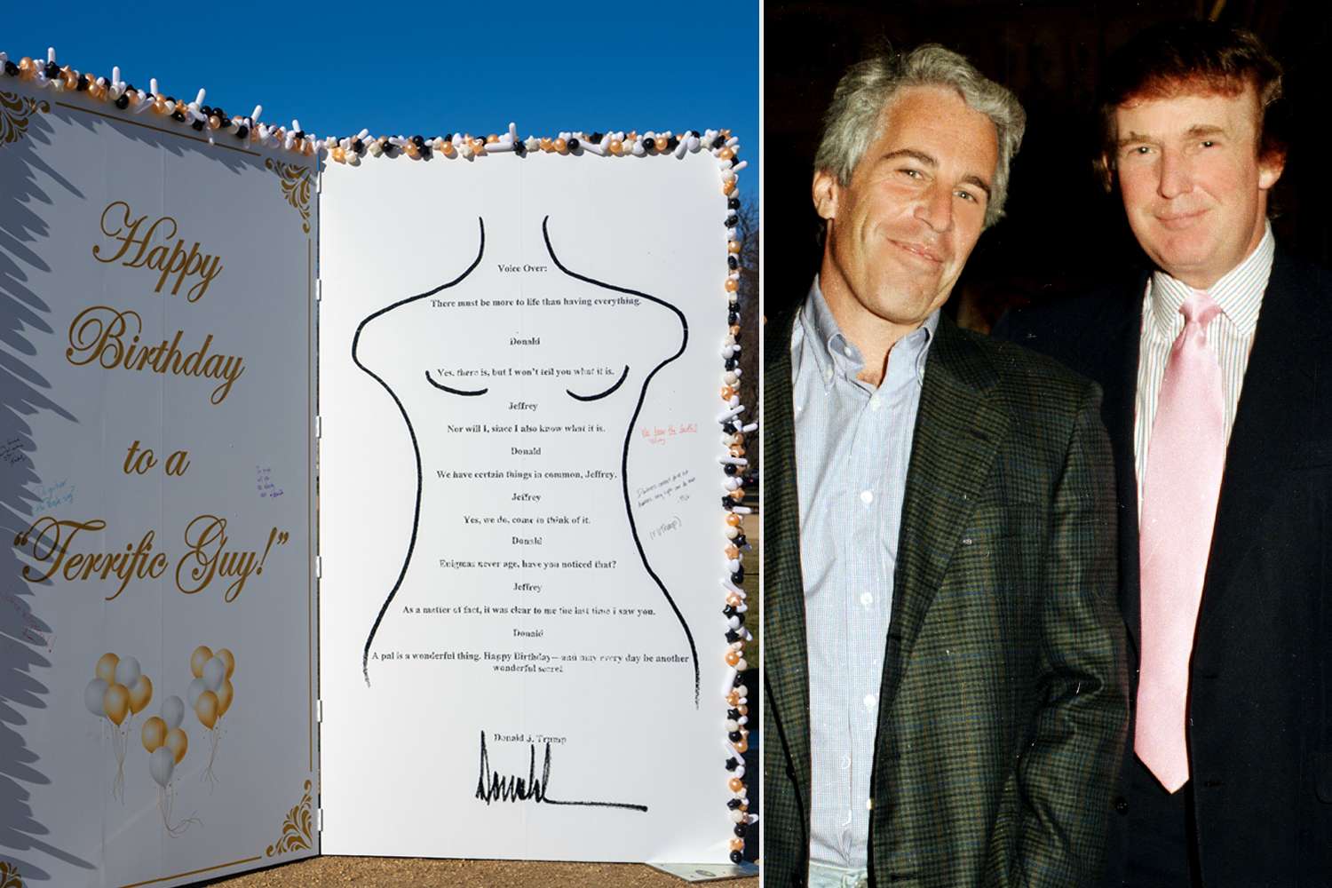 The replica birthday card is a vivid recreation of the original card Trump is accused of crafting for Epstein’s 50th birthday in 2003. It features a black, gold, and white balloon border with a gold script that reads, “Happy Birthday to a ‘Terrific Guy!’” on one side. The other side displays a disturbing poem reportedly penned by Trump, which was made public by House Democrats amid mounting pressure for transparency in the Epstein investigation.